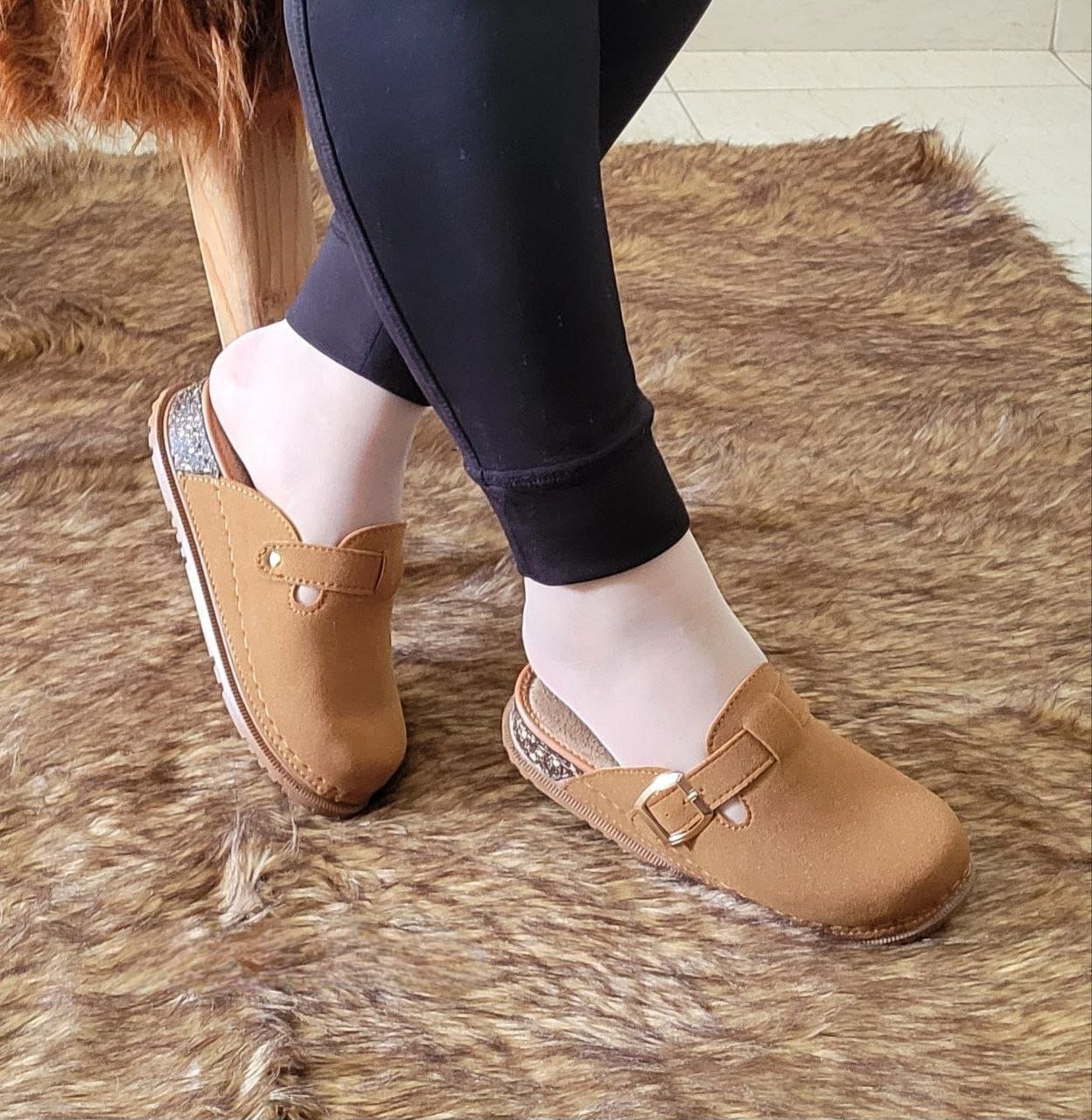 - Matériaux : L’extérieur semble être en suédine ou en cuir synthétique, et la semelle peut être en liège ou en un matériau similaire pour le confort.